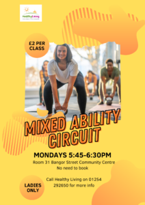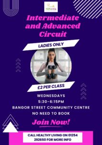 We run three weekly fitness classes for ladies at Bangor Street Community Centre. Monday morning Tummy Toning, Monday evening Mixed Ability Circuit Training and Wednesday evening Intermediate/Advanced Circuit Training. All classes are £2 each.